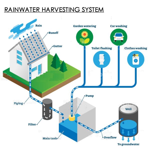 سیستمی است که آب حاصل از بارش را از سطوحی مانند پشتبامها، جادهها یا سطوح طبیعی جمعآوری کرده، فیلتر و ذخیره میکند و برای مصارف زیر مورد استفاده قرار میگیرد:
